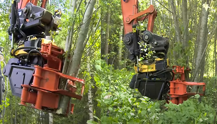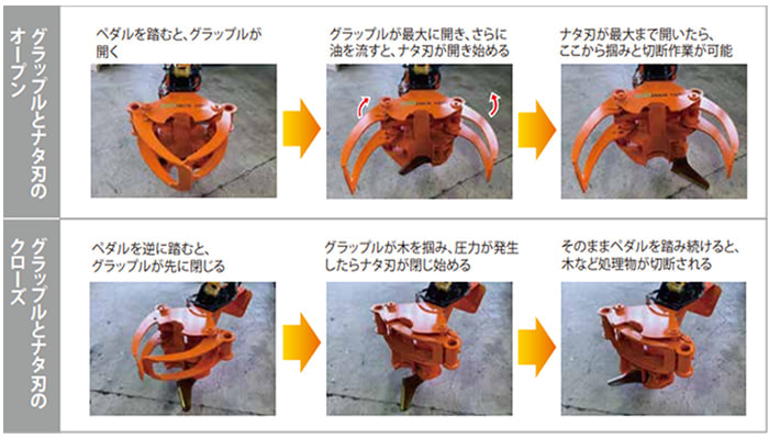 HOME | 買いたい | 木材切断 | 076【買う】フェリンググラップル/建機ジャパン 【フェリンググラップル】 フェリンググラップの特長 フェリンググラップルの特長 ポイント① 0.07m3クラスなどのミニユンボで立木の伐木作業が安全に行えるアタッチメントです。 様々な追加オプションが用意してあり、購入後のアップグレードも可能な仕様になっています。 ↑ スタンダードモデル(0.07~0.1m3用)重量70kg ↑ 油圧旋回モデル(0.2~0.25m3用)重量450kg ※このモデルで重量470kgまでの材の伐木・玉切・掴み作業を安全に行えます。 (参考までに標準のブームとアーム仕様の0.25m3クラスで アタッチメント込の最大積載質量が920kg前後になります。 追加ウェイトを付けているのであればさらに+100kgです) フェリンググラップルの特長 ポイント② 0.2m3クラス(4t)以上であればオプションの旋回ユニットを追加する事により360度油圧旋回が可能となります。 また、旋回ユニットを装着する事により、玉切り作業や集積や積込作業が楽に行えます。 フェリンググラップルの特長 ポイント③ スウェーデン鋼の鉈刃は非常に切れ味が良く、パワーの少ないミニユンボでもスムーズに伐木可能です。 ↑写真は0.2~0.25m3クラス用の刃物です。↑ ↑0.45m3クラスでの切断面です。 尚、このクラスの最大切断径は300mmです フェリンググラップルの特長 ポイント④ 刃の操作に特別なスイッチは必要なく、ペダル操作で制御できます。 フェリンググラップルの特長 ポイント⑤ 用途に合わせオプションの追加装備が可能 1、枝払い機能付きトング 立木の上部を掴んだ状態で下までスライドさせると簡単に枝払いが出来ます。 ※0.2m3以上のクラスの場合は標準で装備されています。 2、Eキット(サブアーム1) 細目の木を連続して伐木出来るようになります。 切った木をサブアームに抱いたまま次の木の伐木に移れます。 ※Eキット(サブアーム)は0.2m3以上のクラスからご利用可能です。 3、EGキット(サブアーム2) 大口径の木や長尺の木を運搬する際に保持を安定させる為に使用します。 4、ベース機や用途に合わせブラケットが選択できます フェリンググラップル仕様 型式適合クラス(ユンボ重量) カット最大径(mm) トング最大開口幅(mm) アタッチメント重量(OP無し) EWG-1101~3tクラス 120 580 59kg EWG-1603~5tクラス 180 840 160kg EWG-1805~8tクラス 200 775 300kg EWG-2306~12tクラス 250 775 230kg EWG-30010~20tクラス 300 775 300kg EWG-45010~20tクラス 450 850 550kg 販売価格 お手数ですが、お問い合わせください。お支払い方法につきましては自社ファイナンス(割賦販売、割賦リース)もご用意しております。 フェリンググラップ動画 【↓興味がある方はこちらから↓】 メールでのお問い合わせはこちらから page 076 上段へ移動