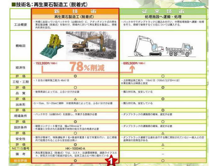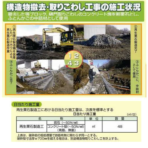 【再生栗石製造工(脱着式)】は現場で発生したコンクリートガラを、割栗石・中割石に再生します。 バックホウ(山積0.8m3)のバケットを専用アタッチメントに取り換えるだけで施工可能になります。バックホウの稼働出来る現場なら施工場所を選びません。水中での作業も可能です。