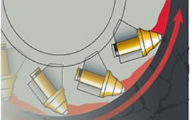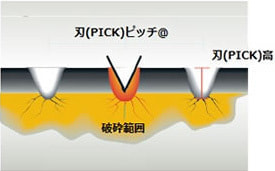 回転運動に使用している油圧モーター、装着するバックホウの油圧、油量の最大値を利用しています。流用出来るバックホウの油圧・油量には限界がある為、これを最大限に利用できるようピック(刃)の形状や個数・配置箇所を設計しています。